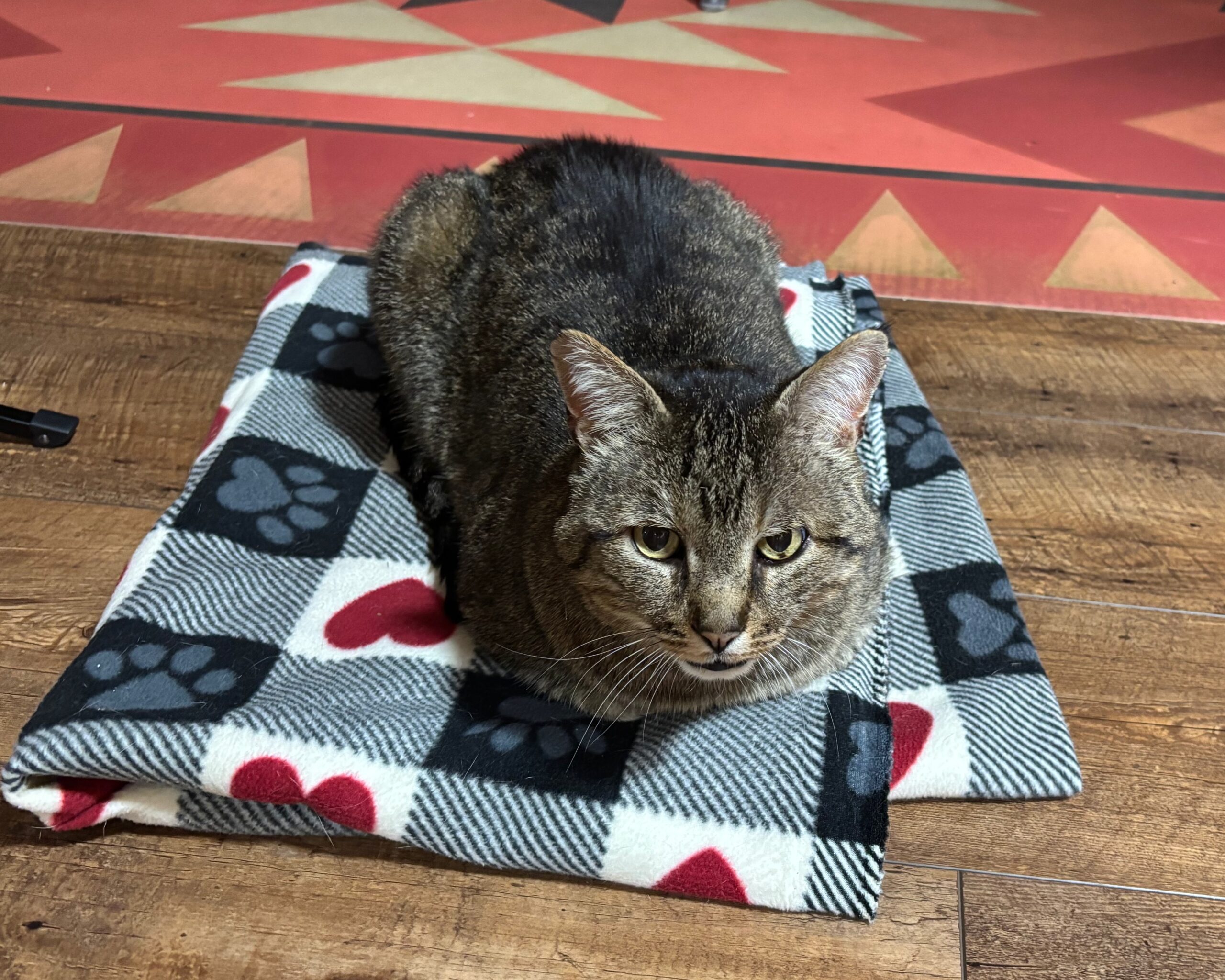 I offered my cat Miso a fleece blanket at the vet, putting it on the sofa next to me in the exam room. Miso was quick to take advantage of this, jumping up and “making biscuits” while waiting for his exam.