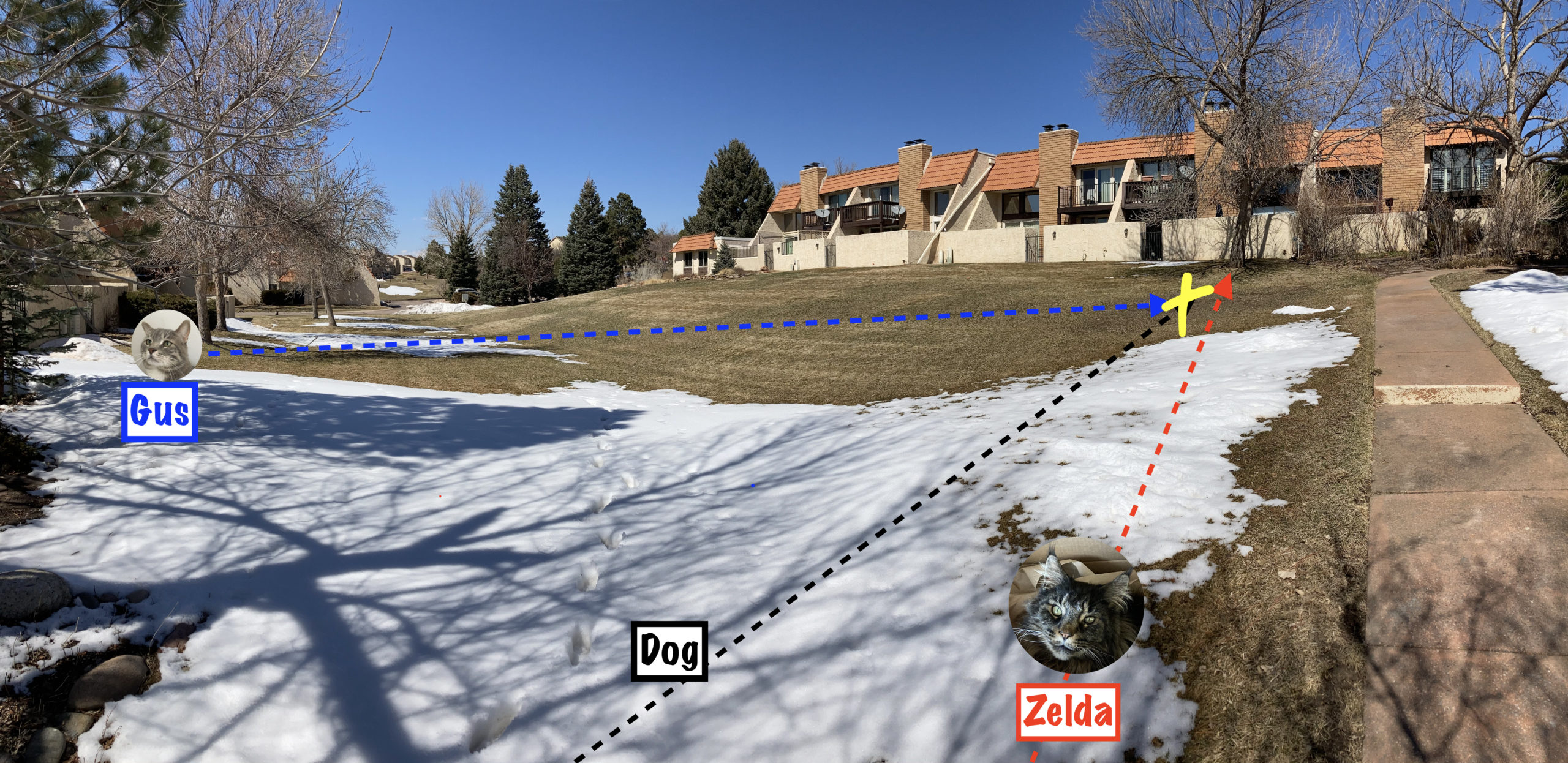 The other day, Zelda, the Maine Coon cat, and Gus, my ex-street cat, were ambling along the sidewalks, stopping to smell things and poke around in the vegetation. Zelda was a few feet away from me. Gus was over noodling around in what was left of a snowbank.